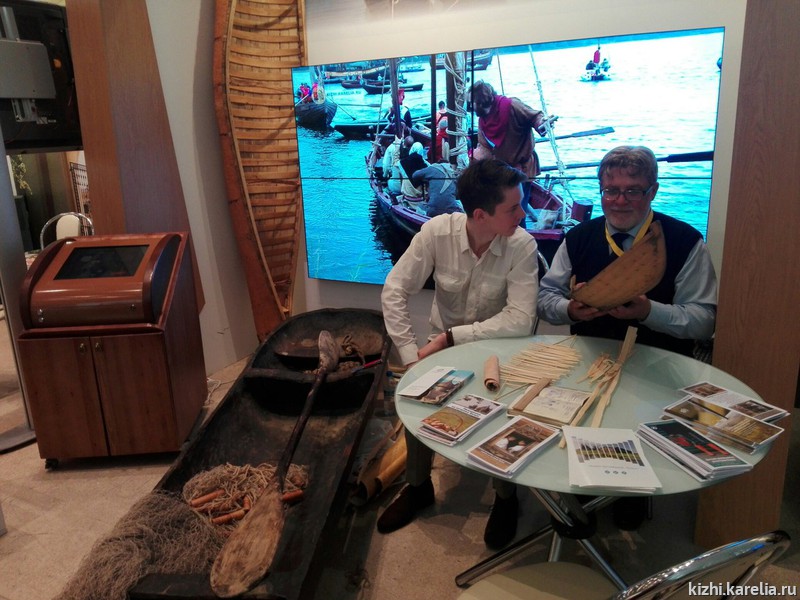 В работе стенда принимают участие специалист по просветительской работе музея «Кижи» Марина Ноженко, ведущий научный сотрудник сектора экспозиционной работы Юрий Наумов и неоднократный участник «Кижской регаты», мастер берестяных лодок Алексей Рыбаков.