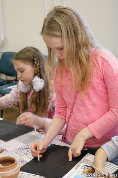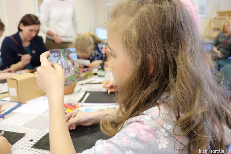 Для ребят из петрозаводской гимназии № 30 и участников музейной студии «Кижская палитра» мастер-класс провела художник-реставратор древнерусской живописи Музея изобразительных искусств Республики Карелия Мария Смирнова. Темой для детского творчества стали храмы Заонежья.