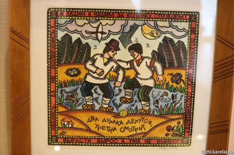 «Сделано в СССР», «Ностальгия по утраченному» — выставку можно было назвать и так. Карелия в 90-ые годы потеряла целый ряд предприятий, выпускавших знаковую сувенирную продукцию, узнаваемую не только в России, но и в мире. Но авторы — ведущий научный сотрудник отдела истории и этнографии Людмила Трифонова и начальник отдела реставрации фондовых коллекций музея «Кижи» Игорь Гашков — назвали выставку «Птица сирин, лев и другие». Сирин — в древнерусском искусстве и легендах райская птица с головой девы. Изображение сказочной птицы, также как и льва, можно увидеть на резных шкатулках, красочных панно, вышивке, керамике.