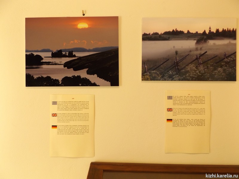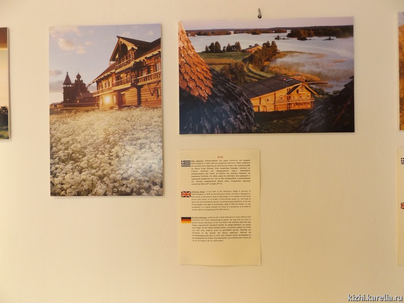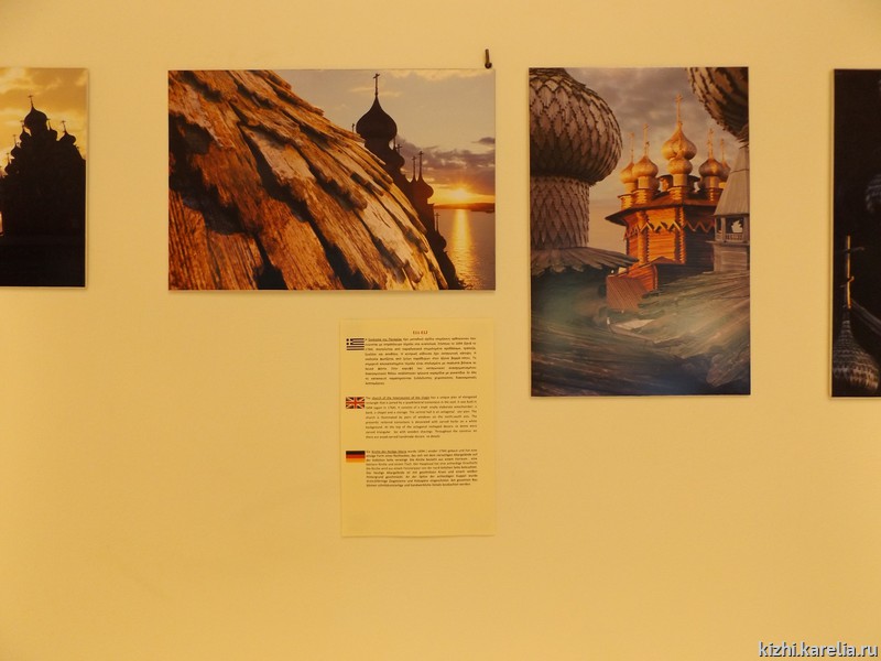 Экспозиция представлена видовыми фотографиями прекрасных и утонченных храмов острова Кижи, шедевров русского деревянного зодчества — Кижского архитектурного ансамбля, внесенного в список всемирного культурного и природного наследия ЮНЕСКО, а также других памятников, расположенных на острове в центре Онежского озера. Выставка будет работать до сентября 2017 года.