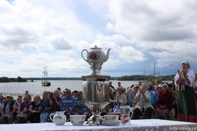 6 августа «Кижская регата» продолжилась в селе Великая губа. Здесь состоялся почти семейный праздник — односельчане могли с берега наблюдать за лодочными гонками, угощаясь чаем и пирогами за большим столом.