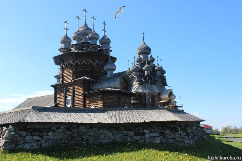 «В лабиринте шхер — сотен островов на Онежском озере — таится остров Кижи. Стоит путнику высадиться на него, как он переносится на три века в прошлое: в мир уютных крестьянских изб, деревянных мельниц, колоколен и амбаров. Главной достопримечательностью острова остается ансамбль деревянных церквей XVIII века — в особенности, знаменитая 22-купольная Церковь Преображения Господня.