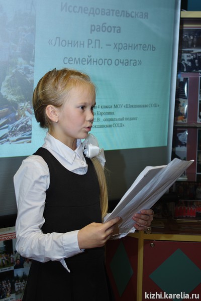 Среди почётных гостей были и трое сыновей основателя музея — Рюрика Петровича Лонина. А растрогало всех выступление Каролины Лониной — правнучки вепсского краеведа Рюрика Петровича. Она подготовила и прочитала посвящение своему прадедушке. Потомки Лонина, безусловно, гордятся своим легендарным предком, так же, как им гордятся все жители Прионежского района, да и всей Карелии.