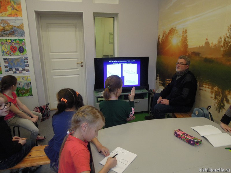 Знакомство с музейными профессиями продолжилось на встрече с Юрием Михайловичем Наумовым, главным специалистом в области традиционного судостроения нашего музея, который рассказал детям и о лодке-кижанке, которая, по образному определению Юрия Михайловича, вплыла в 21 век, о видах традиционных лодок, о том, как перевозили сено, скотину. С интересом посмотрели фильм о «Кижской регате», празднике, который все больше набирает обороты.