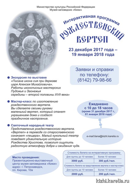 С 23 декабря по 19 января музей-заповедник «Кижи» приглашает детей и взрослых принять участие в праздничных интерактивных программах - «Рождественский вертеп» и «Малый рождественский вертеп». Две новые выставки на пл. Кирова, 10А, кукольное представление и мастер-класс по созданию новогоднего сувенира оставят незабываемые впечатления. Заявки на участие принимаются уже сегодня!