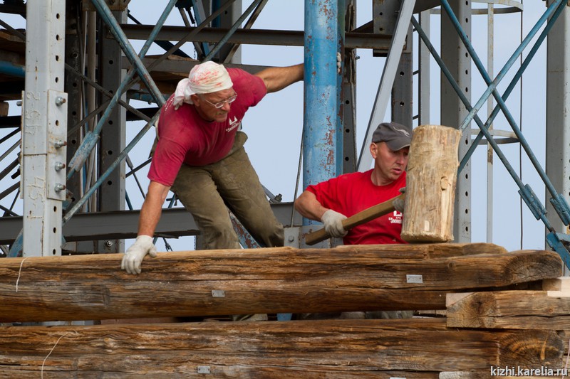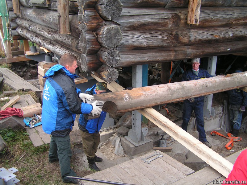 Сотрудничество музея «Кижи» с петербургской строительной фирмой «Алекон» продолжается уже более 13 лет. Специалисты именно этой компании занимались изготовлением и монтажом металлических конструкций лифтинга, а также вывешиванием и фиксацией сруба с передачей нагрузки на внутренний силовой металлический каркас, подведением надежного фундамента, разборкой очередного технологического пояса.