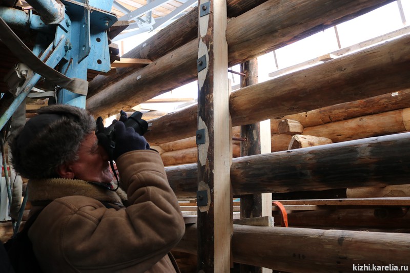 Напомним, что с началом реставрации храм был разделен сверху вниз на семь поясов, каждый из которых отдельно крепился к внутреннему металлическому каркасу, установленному в церкви в начале 80-ых годов прошлого века. По мере реставрации пояса один за другим изымали из конструкции, начиная с самого нижнего пояса, для разборки и реставрации отдельных элементов, а также исправления накопившихся за века деформаций, искажавших историческую геометрию сооружения и нарушавших его устойчивость. Затем отреставрированные пояса вновь занимали свое место в срубе и сейчас отреставрированная часть сруба — с седьмого по третий пояса — сохраняет устойчивость самостоятельно, не нуждаясь в фиксации к металлокаркасу. Таким образом, после демонтажа первого, самого верхнего, пояса в феврале этого года металлокаркас служит лишь для поддержки внутренних лесов и вспомогательных конструкций, которые будут разобраны после завершения работ.