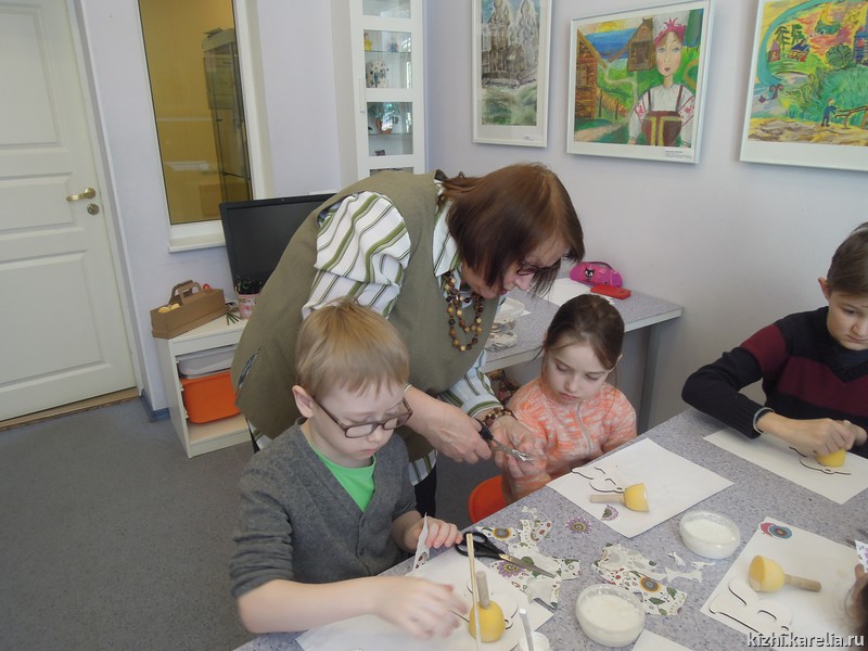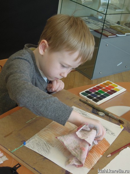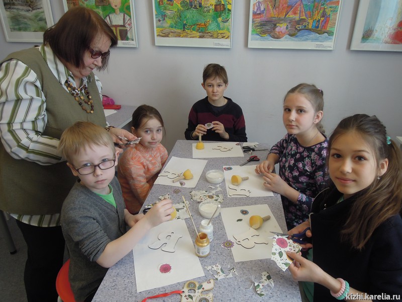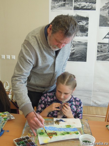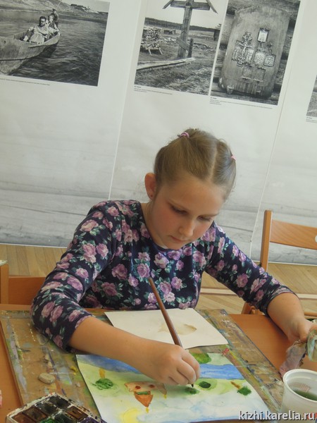 На глазах детей Владимир Петрович создал образ одной из святынь острова Кижи — Нарьиной горы. Вдохновленные примером мастера, участники программы нарисовали каждый свой рисунок по теме, связанный с островом Кижи. В ходе мастер-класса Владимир Петрович консультировал детей, деликатно управляя творческим процессом. В этот день дети попробовали себя еще в одной технике — витражной. Мастер-класс «Разноцветные Кижи» провела для них сотрудник Детского музейного центра Елена Ивановна Филиппова. Настоящим праздником для участников «Умных каникул» стала встреча с сотрудником отдела изучения и музейной презентации фольклорного наследия Еленой Викторовной Герасимовой, которая познакомила детей с программами фольклорно-этнографического ансамбля музея-заповедника «Кижи» и разучила с ними несколько народных игр.