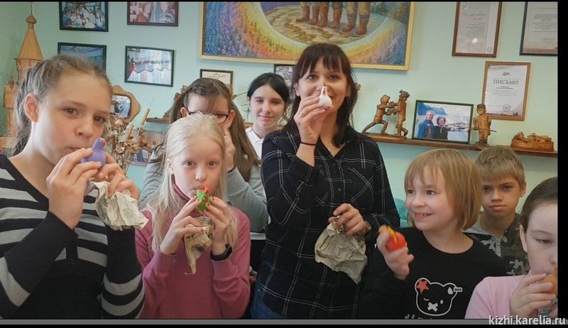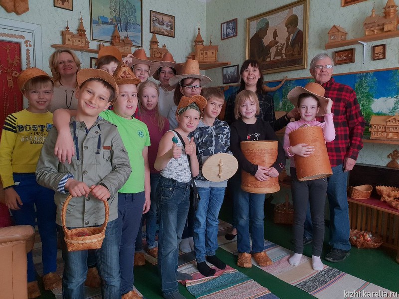 Было много интересных предметов и украшений из бересты. Удивительно, что можно было увидеть не только предметы, которые раньше использовались в хозяйстве, но и берестяных кукол, среди которых были герои карело-финского эпоса «Калевала» и персонажи любимых сказок. Дети сыграли в берестяные шахматы и примерили берестяные головные уборы.