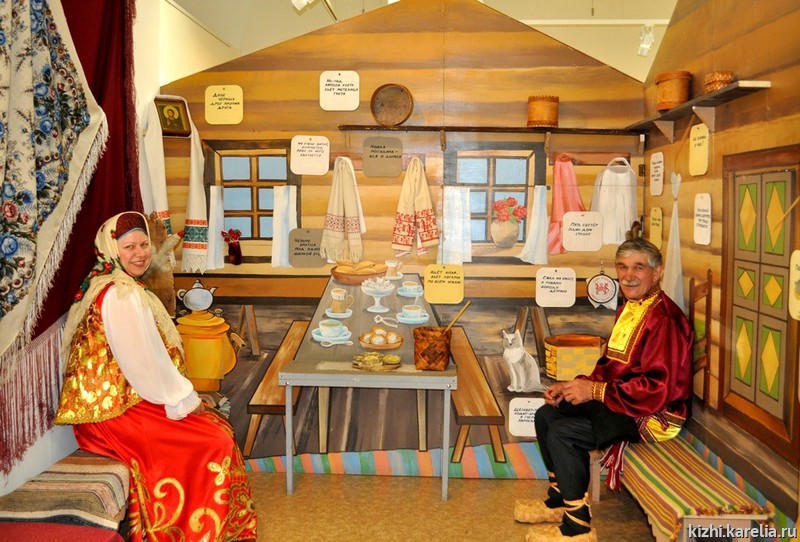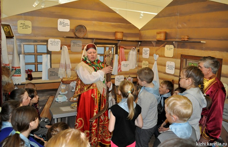 На открытии выставки юные посетители с азартом отгадывали карельские, вепсские и русские загадки. Помогали им в этом герои в традиционных костюмах и Хозяйка загадок — Мария Петровна. Познавательная игра и желание поскорее найти отгадки заманили ребят в крестьянский дом, в амбар и баню, к берегу озера и в лес. Самыми сложными оказались карельские загадки, но внимательные путешественники отважно справились с заданиями.