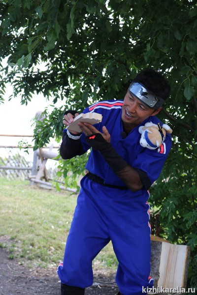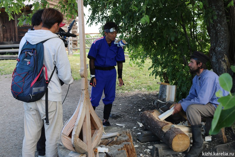 Одно из главных удивлений Майото связано с лемехом. Это делают из дерева? Топором? И он получается вот такой изогнутый?! Как именно делается лемех, наглядно показал кижский мастер Евгений.