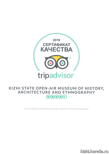 «TripAdvisor», ведущий портал о путешествиях в мире, вручил музею-заповеднику «Кижи» сертификат качества за получение высоких оценок от путешественников на протяжении 5 лет.