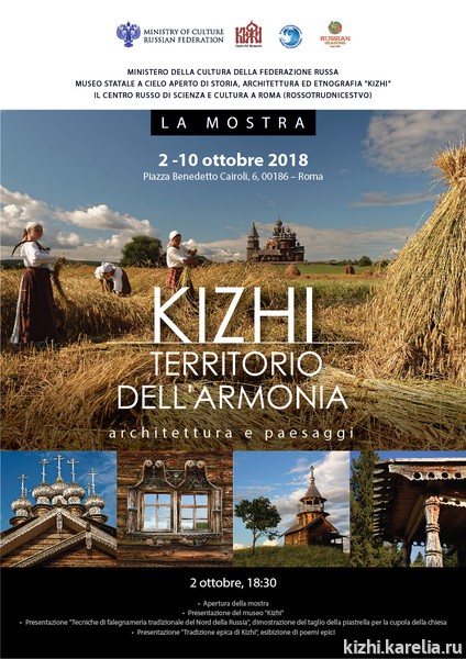 2 октября музей-заповедник «Кижи» открывает выставку «Кижи. Территория гармонии» в Риме. Выставка является одним из мероприятий международного фестиваля «Русские сезоны» в Италии. «Русские сезоны» — глобальный фестиваль, который открывает новые возможности для межкультурного диалога и показывает, как культура выступает истинным Послом Мира. В рамках проекта на протяжении года в одной из стран публике презентуется богатство, самобытность и масштаб культуры России. Проект проводится в соответствии с поручением Президента Российской Федерации В. В. Путина, а также распоряжением Председателя Правительства Российской Федерации Д. А. Медведева.