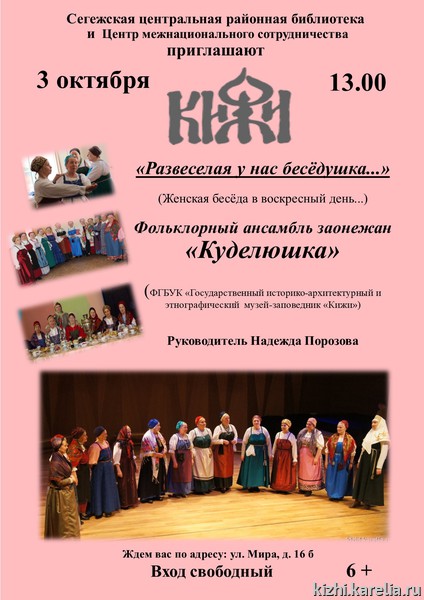В Сегежской центральной районной библиотеке с аншлагом прошла презентация новой программы «Развесёлая у нас бесёдушка». В зале собралось более 70 человек. Ведущая встречи Елена Герасимова рассказала об особенностях крестьянской жизни на севере, о женской доле, которая порой была нелегкой. На встрече звучали песни на заонежском диалекте, участницы показали народные танцы, а также пригласили станцевать кадриль и ланцы всех желающих. Людмила Ивановна Николаева, участница коллектива, рассказала удивительную историю о «жизни платка». Невозможно представить — данному платку уже более 100 лет. В завершение встречи Алла Рощина, краевед и сегежский поэт, прочитала свое новое стихотворение, которое посвятила фольклорной группе «Куделюшка».
