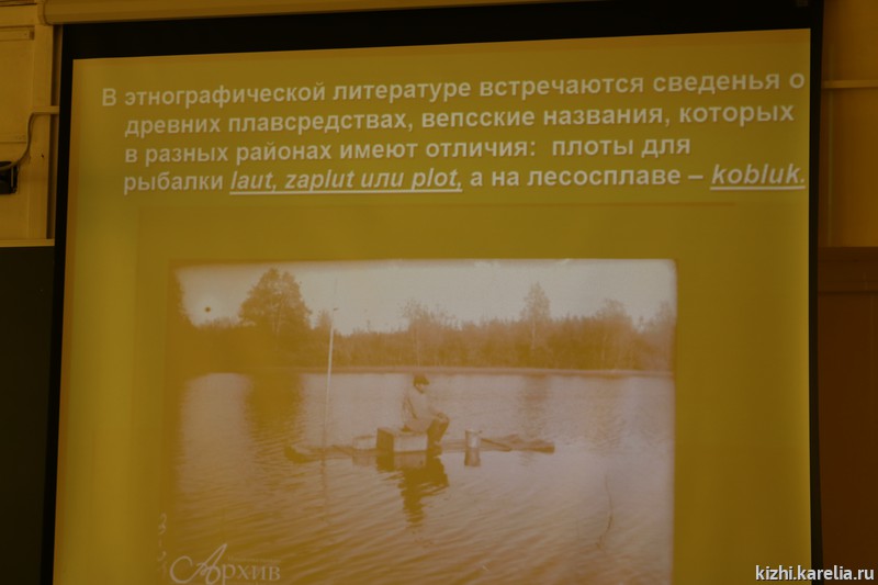 Центральной темой выступления ведущего научного сотрудника музея «Кижи», отца-основателя «Кижской регаты» Юрия Наумова, конечно же, была вепсская лодка. Ещё в XIX веке южные вепсы для рыбалки и переправы через небольшие водоёмы пользовались различными долблёнками: небольшими ройками, спаренными из двух выдолбленных стволов и разведёнными осиновками, которые назывались венех или венях. На Ояти и небольших речках челноки называют хонгой, встречается и другое название — karbaz. В опубликованной литературе о вепсах названия вепсских дощатых лодок имею различия: малая лодка — vene, многовёсельная лодка — soim. В некоторых источниках дощатые лодки называются «карбас, сойма или баркас», встречается название коммерческого судна большого размера — laiv, шитые килевые лодки прионежских вепсов называются «кижанки». Некоторые исследователи даже считают, что эти названия лодок вошли из вепсского в русский язык. Старшеклассники активно дискутировали с лектором — употребляются ли сейчас такие названия лодок в Рыбреке, рассказывали, какие лодки были у их дедушек.