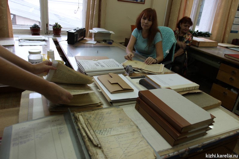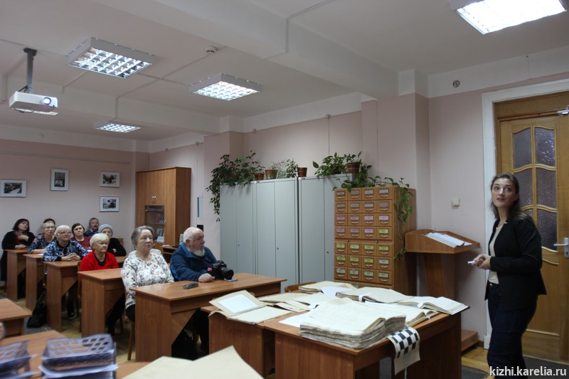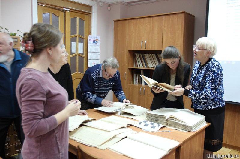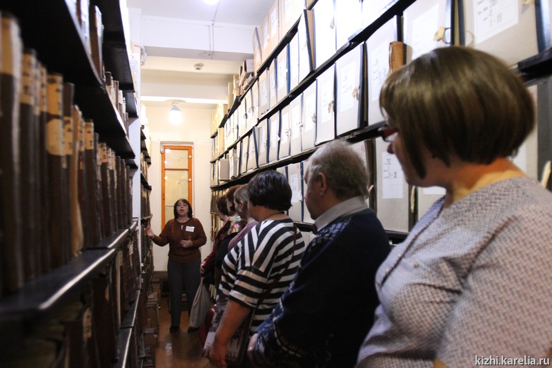 Участники познакомились с основными направлениями деятельности архива, видами документов, которые сегодня хранятся в архиве, а также узнали об электронных ресурсах, размещённых на сайте архива. Специалисты архива подготовили для встречи документы, которые относятся к территории Заонежья: метрические книги, ревизские сказки, клировые ведомости и другие. Для участников было интересно увидеть своими глазами запись в метрической книге о рождении Ирины Андреевны Федосовой, информацию о Трофиме Рябинине на основании ревизских сказок. Для сотрудников музея «Кижи» презентовали самую первую книгу отзывов, которая теперь бережно хранится в архиве, а первая запись о посещении острова была оставлена Леонидом Утесовым, народным артистом СССР.