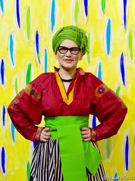 Что объединяет национальные костюмы Карелии и авторскую одежду Елены Теплицкой? Безусловно, яркий, «громкий» цвет, пестрядность и многослойность. У слова «пестрядь» два значения — это и льняная или хлопчатобумажная ткань из разноцветных ниток, обычно домотканая, и собственно пестрота, разноцветность. Когда в июне этого года Елена Теплицкая гостила на острове Кижи, она везде находила яркие краски — на вышивке заонежских полотенец, на прялках и лоскутных одеялах, в рассветах и закатах над заповедным островом. Особый интерес Елена Теплицкая проявила к народным костюмам. Встреча с фольклорным ансамблем музея «Кижи» произвела на модельера большое впечатление.