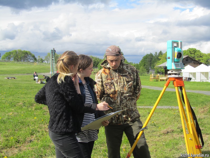 Красотой Кижей наша группа вдохновлялась на пленэрах. Что же «говорила мера» карельским зодчим, мы постигали, производя обмеры полюбившихся построек. Необходимым этапом нашей работы было выполнение кроков (сделанных от руки чертежей непосредственно рядом с объектом). В них мы вносили размеры зданий, делали заметки о конструкциях. Для обмеров использовалась обычная и электронная рулетка. Нам также посчастливилось поработать с тахеометром под чутким руководством Михаила Васильевича Теребова, руководителя Службы по учёту и хранению недвижимых памятников. С его помощью мы измерили труднодоступные участки (например, размеры креста часовни Петра и Павла). В связи с тем, что исторические деревянные постройки обладают определенной кривизной, очень важно было установить вертикаль с помощью отвесов и обозначить горизонтальную «красную линию» с помощью толстой нитки. Мы сооружали хитроумные конструкции из угольников и линеек, использовали тяжелые булыжники в качестве груза для отвесов, чтобы их не сносило ветром… Каждый день мы вставали в 6 утра и работали до 10 вечера при свете белых ночей. И при этом желание обмерять и узнавать что-то новое об острове только возрастало.