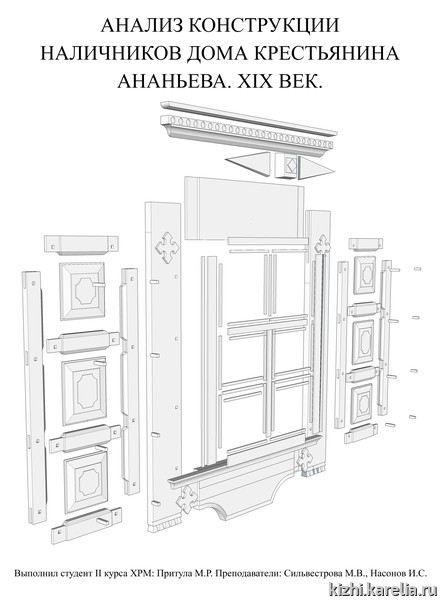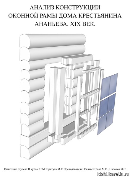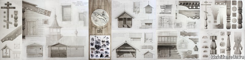 По возвращении в Академию перед нами встала довольно непростая задача: продумать общую концепцию и композицию подачи, которая не только бы была гармонично скомпонована и давала информацию о каждом архитектурном памятнике, но и отображала общее впечатление от кижской архитектуры. Основной сложностью на данном этапе было принятие общего решения, которое бы всех устраивало. В результате долгих обсуждений мы пришли к выводу провести своеобразное научное исследование. Главной нашей задачей стало создание материала, по которому можно восстановить или заново построить здание. Именно поэтому большое внимание мы уделили точным размерам постройки и ее деталей, конструктивным особенностям. К сожалению, уже выполняя чертежи в Москве, мы обнаружили, что не до конца разобрались в конструктиве архитектурных памятников. Решить эту проблему нам помогли работы А. В. Ополовникова, сделанные ранее другими архитекторами чертежи построек, а также отзывчивость сотрудников музея, благодаря которым нам удалось разобраться в тонкостях конструкций деревянного зодчества.