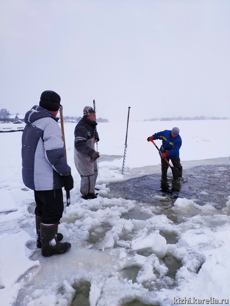 К празднику в деревне Ямка на льду Онежского озера была подготовлена крещенская купель. Настоятель Кижского прихода отец Павел совершил чин великого освящения воды.