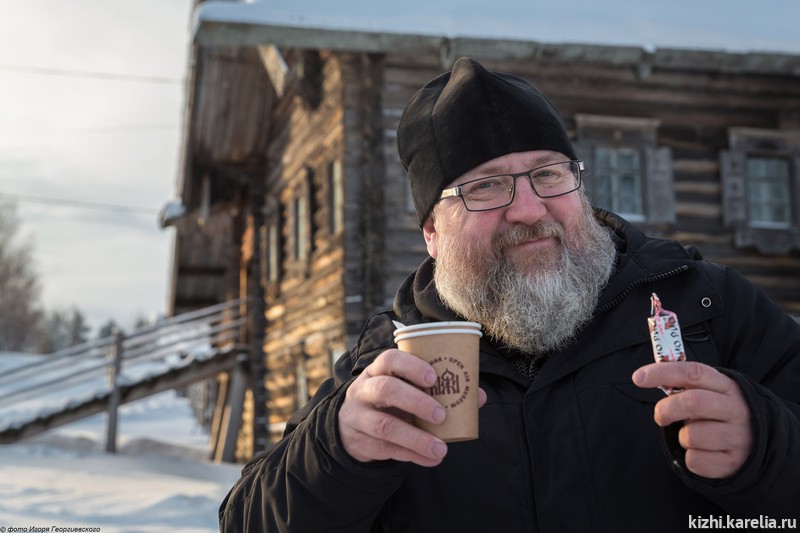 После купания на берегу работала полевая кухня с горячей кашей, кижским чаем и сладкими угощениями. Добрая атмосфера острова и душевное тепло согревали участников праздника в зимний день.