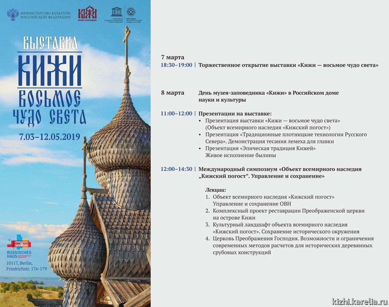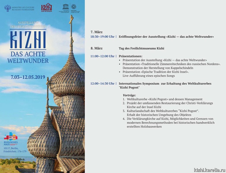 8 марта — день музея-заповедника «Кижи» в Российском доме культуры и науки. Будут представлены презентации и лекции, посвящённые самым разным сторонам жизни прекрасных памятников Кижского погоста. Все лекции будут переводиться на немецкий язык.