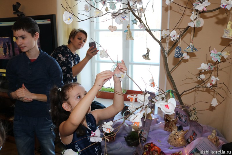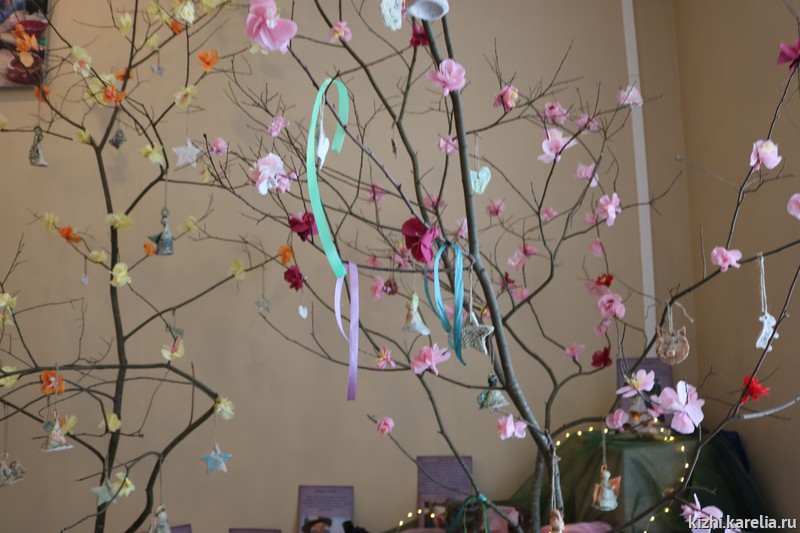 На выставке появилась творческая инсталляция — выросли два дерева, где живут добрые ангелы. Авторы работ, родители и гости выставки завязывали ленточки с добрыми пожеланиями на деревьях.