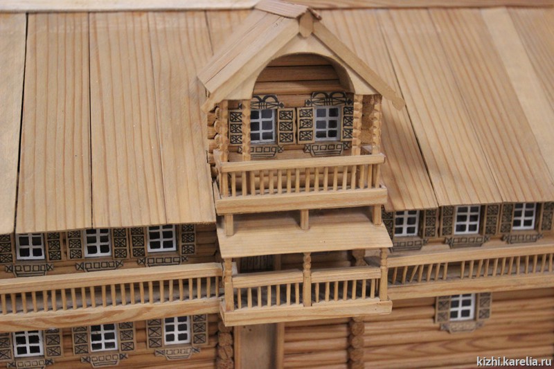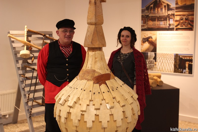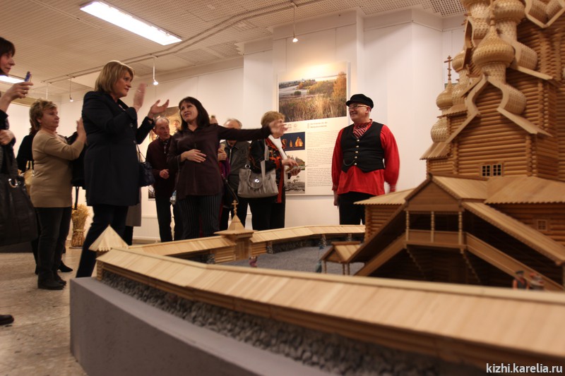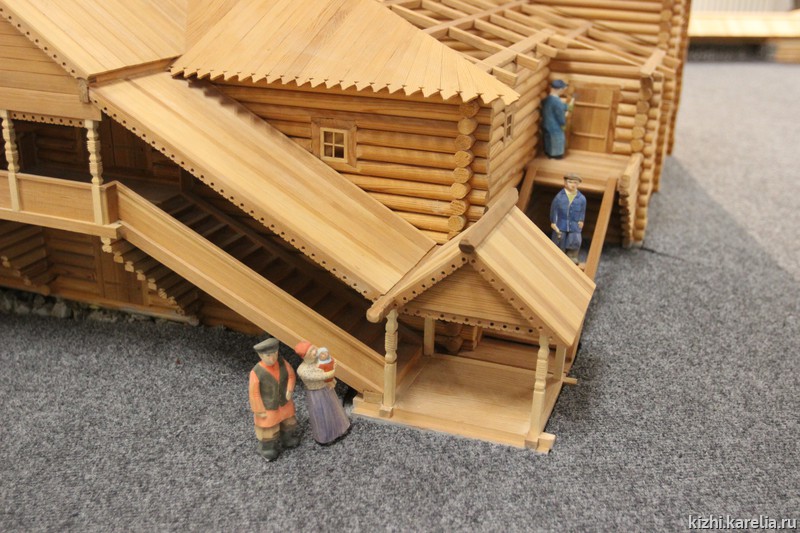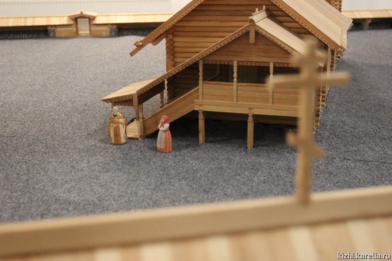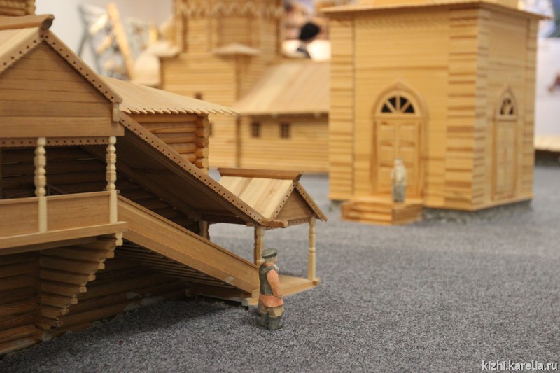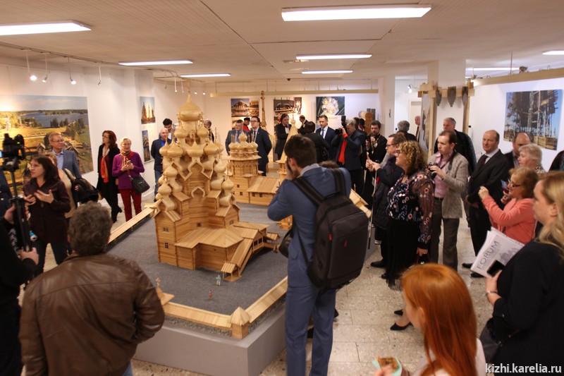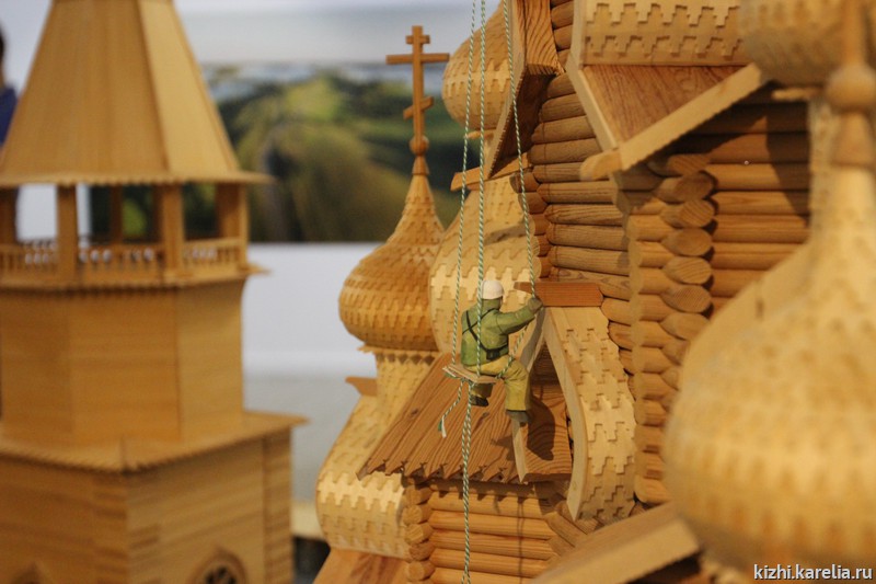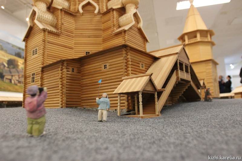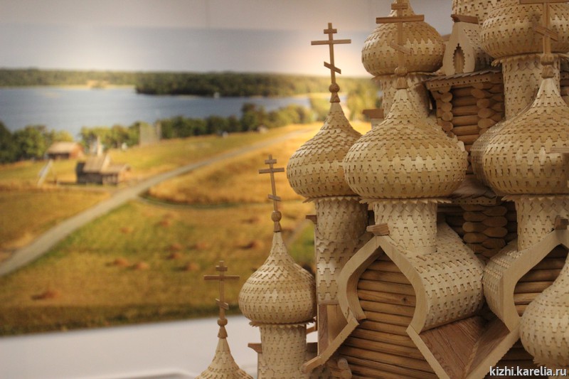 Центральным экспонатом выставки стал масштабный макет Кижского погоста – одного из трех первых объектов ЮНЕСКО в России, наряду с Московским Кремлем и историческим центром Санкт-Петербурга. Алла Манилова особо отметила высокое качество его исполнения. Один из создателей макета – сотрудник Плотницкого центра музея Василий Варенов – присутствовал на выставке и участвовал в ее монтаже. Макет точно воспроизводит памятники погоста: главки и бочки окрыты настоящим миниатюрным лемехом, декоративные элементы украшены резьбой, сквозь окна Преображенской церкви даже можно увидеть металлокаркас, смонтированный внутри оригинала для нужд реставрации в 1982 году. Внутри погоста можно видеть миниатюрные фигурки, которые помогают оценить масштаб постройки и представить ее вживую: турист, гид, реставратор, священник, крестьяне, милиционер.