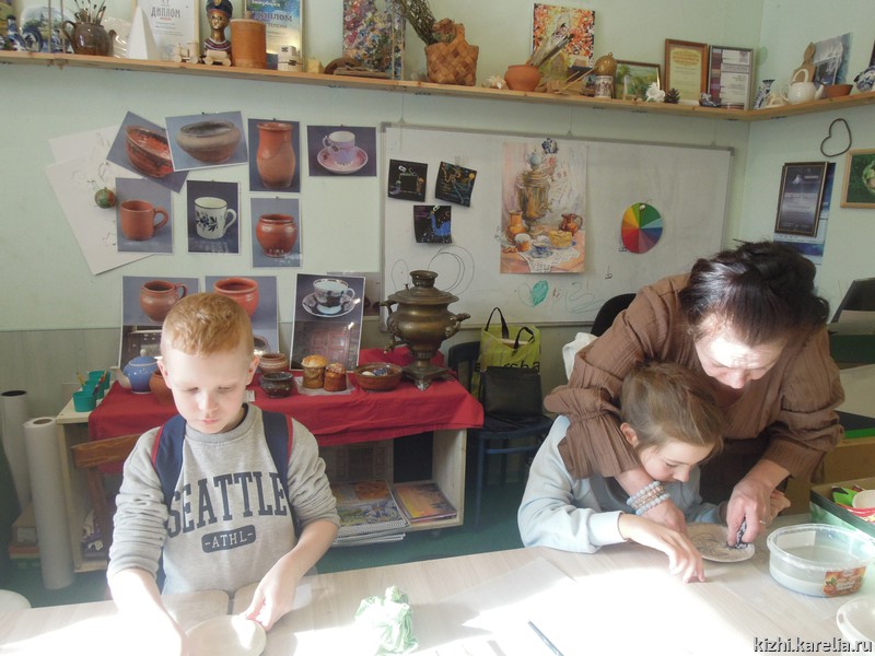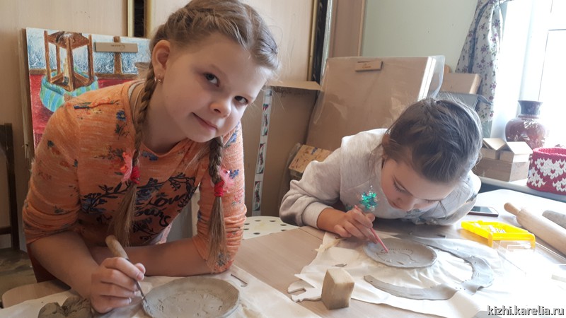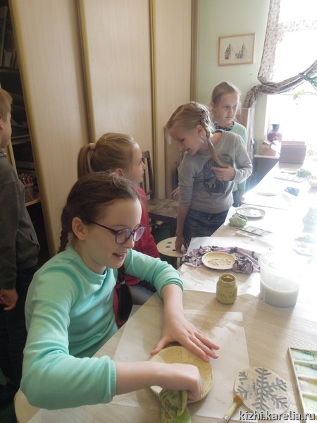 «Весеннее настроение» (так называлось занятие) нашим каникулярам подняли мастер-классы в технике керамики, которые провела для них Светлана Петрякова, руководитель студии «Кижская палитра». Помимо керамики, за пять дней каникул детям было предложено расписать пряник (и съесть его!), создать браслет из фетра, игрушку-оберег, освоить некоторые приемы берестоплетения, изготовить и украсить санки.