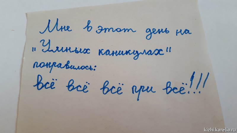 Одна из постоянных участниц каникул Люба Краснова, ученица 3-го класса лицея № 1 г. Петрозаводска в ответ на вопрос, что ей больше всего понравилось на «умных каникулах», написала: «Мне понравилось всё-всё-всё-пре-всё!»