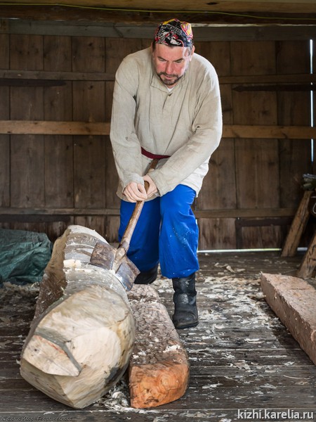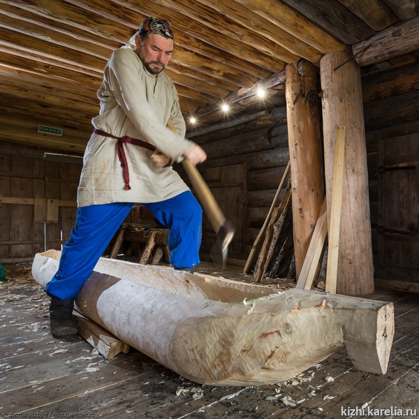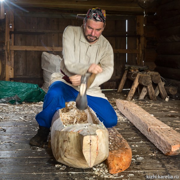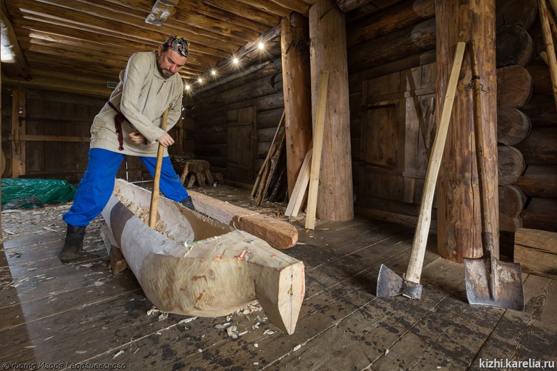 Затем новоиспеченный мастер познакомился с одним из основателей и вдохновителей «Кижской регаты» старшим научным сотрудником музея «Кижи» Юрием Наумовым и директором музея Еленой Богдановой. В результате, Геннадий взялся изготовить лодку-долбленку на островной экспозиции музея, не используя современные инструменты. «Впервые я попробовал работать топором в Галинском, – говорит Геннадий, – и понял, что вполне могу с ним управиться, надо только изменить форму рукояти».