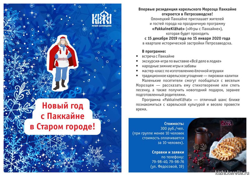 16 декабря в 12.00 резиденция Карельского Морозца Паккайне откроется в квартале исторической застройки Петрозаводска. Музей «Кижи» презентует праздничную программу «PakkaineKižhat» (игры с Паккайне), место проведения — музейный дворик, Неглинская набережная, 3.