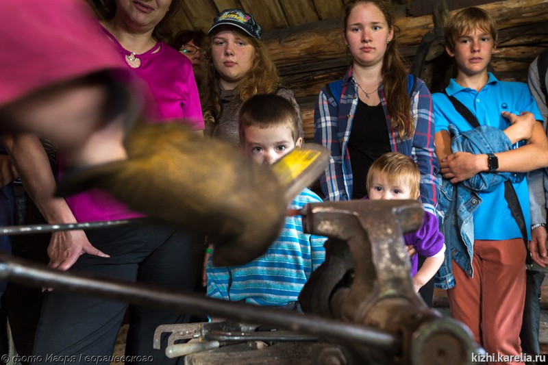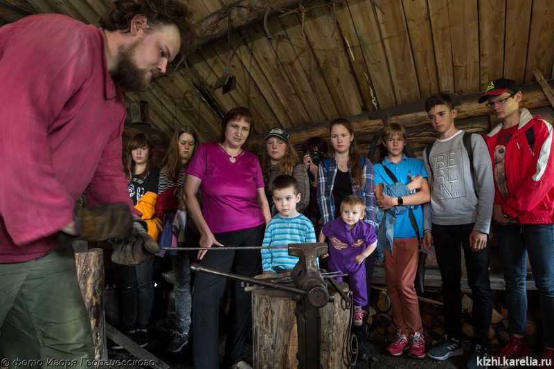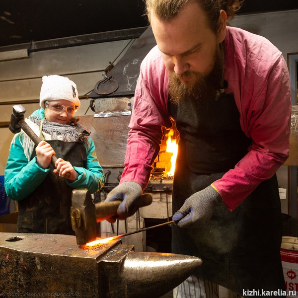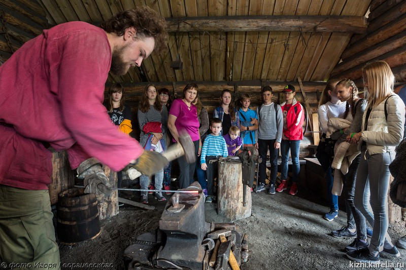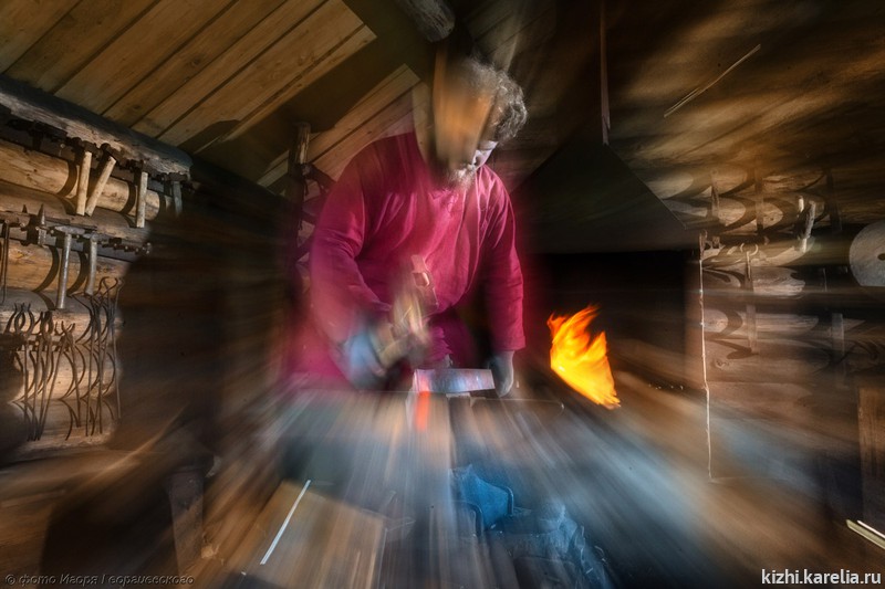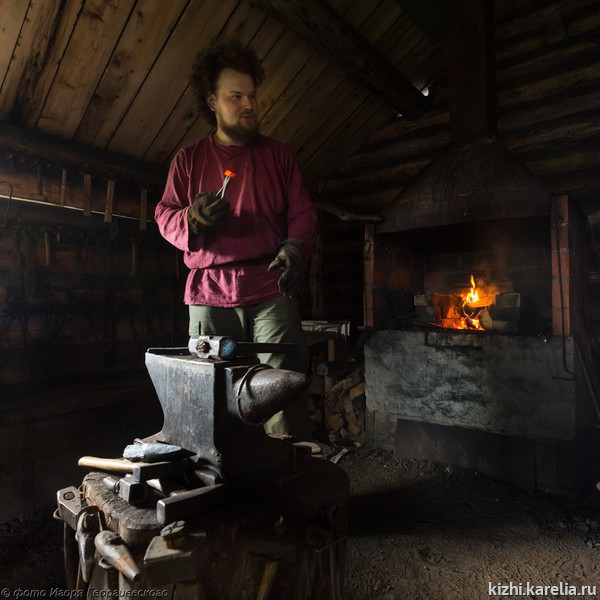 Среди многочисленных интереснейших женских и мужских занятий, познакомиться с которыми можно на острове Кижи, кузнечный промысел занимает своё достойное место. Это одно из самых древних, но до сих пор востребованных ремёсел. Работать кузнецом всегда было престижно, люди особенно уважали кузнеца за те таинственные метаморфозы, которые происходили с кусками железа, превращающимися в его руках в практичные предметы. Его даже побаивались, как шамана, знахаря или колдуна, ведь кузнец был единственным человеком в деревне, имеющим дело с очень опасным явлением — огнём.