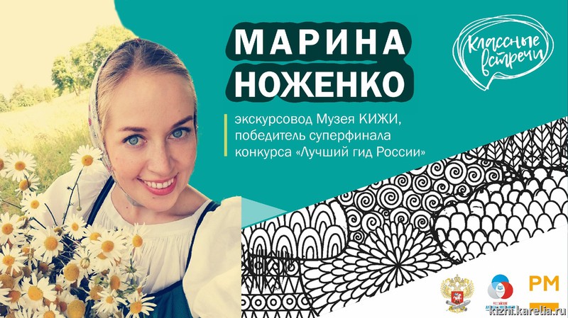 Специалист музея-заповедника «Кижи» Марина Ноженко приняла участие во Всероссийском проекте Российского движения школьников «Классные встречи». Проект направлен на профориентацию подрастающего поколения и реализуется в рамках поручений Президента Российской Федерации Владимира Путина.