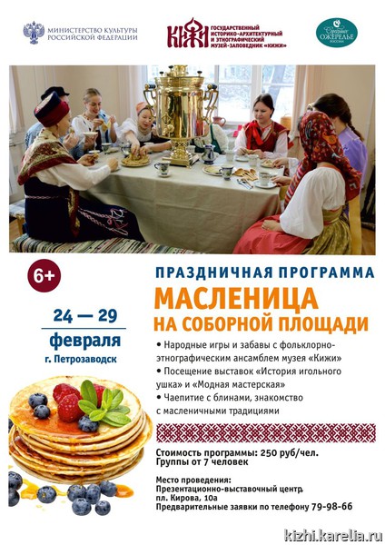 С 24 по 29 февраля в самом центре Петрозаводска — в выставочном зале на пл. Кирова, 10а и на площадке перед ним пройдет праздничная программа «Масленица на Соборной площади». Музей-заповедник «Кижи» приглашает всех желающих встретить весну весело!