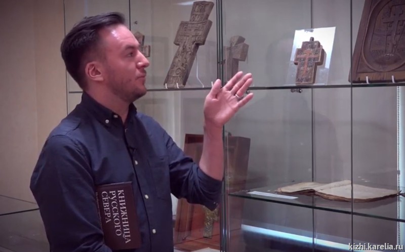Художник и коллекционер Максим Максимов рассказывает о старообрядческих резных крестах и иконах из своего собрания на выставке «Книжница Русского Севера» в музее «Кижи».