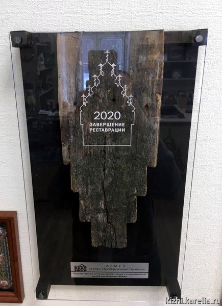 22 главки Преображенской церкви покрыты лемехом — осиновой «черепицей», изготовленной вручную (с помощью топора). Исторические лемешины оформлены под стеклом в короб из пластика, чтобы каждый посетитель музея смог увезти с собой частичку главной кижской ценности — Преображенской церкви. Цена 1500 руб.