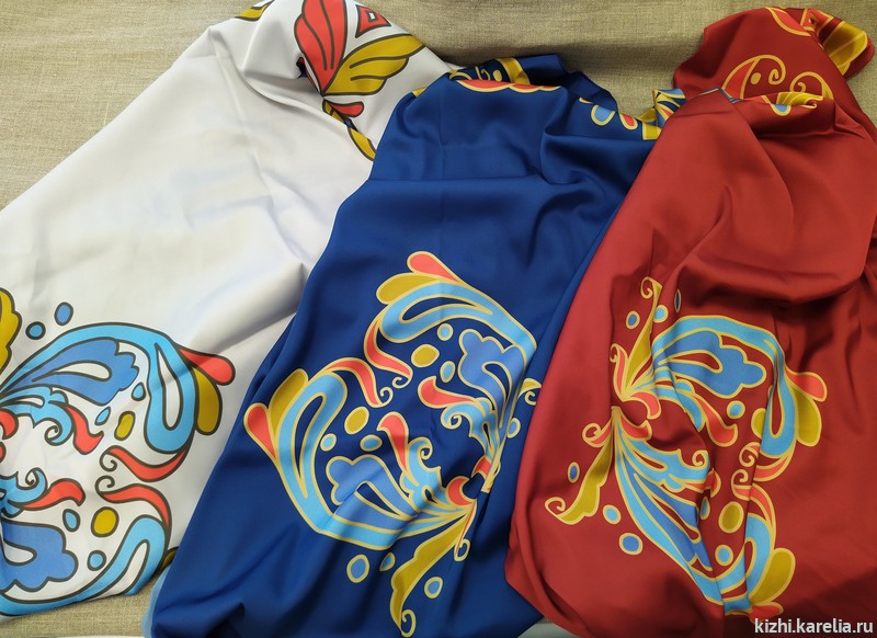 Дизайн принтов коллекции шёлковых платков разработан на основе элементов исторической росписи предметов быта и мебели крестьян Заонежья XIX века. Платок квадратной формы, размер 90 × 90 см. Края обработаны микрооверлоком. Ткань «шёлк армани» (97% полиэстер, 3% эластан) невероятно нежная, с шелковистой фактурой и благородным матовым блеском. Платок комфортен в повседневном ношении, лёгок, изящен, красиво «ложится» по фигуре, «дышит» и не мнётся. Расцветки: синий, белый, красный. Цена 1100 руб.