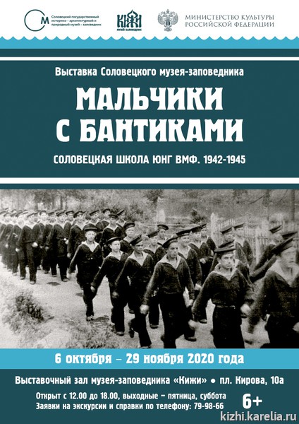 6 октября в 14:15 в презентационно-выставочном центре музея-заповедника «Кижи» (площадь Кирова, 10 а) откроется выставка «Мальчики с бантиками. Соловецкая школа юнг ВМФ. 1942–1945». Экспозиция посвящена 75-летию Победы и 80-летию создания Учебного отряда Северного флота ВМФ на Соловецких островах.