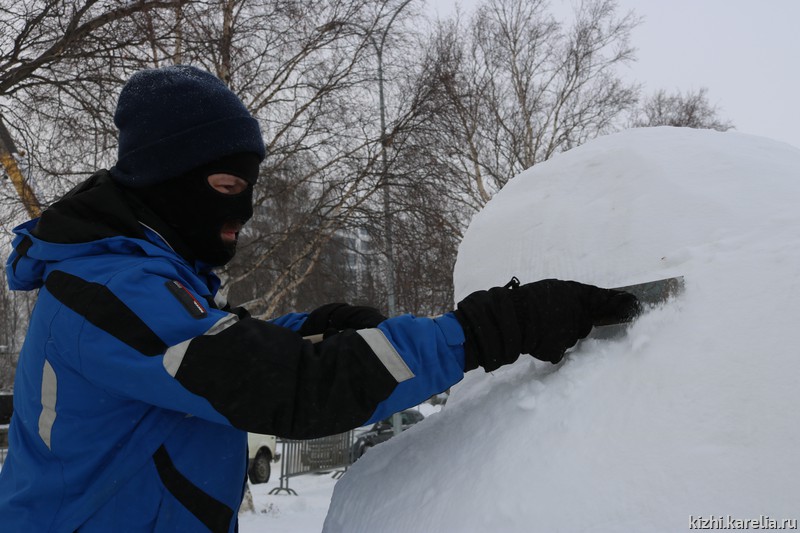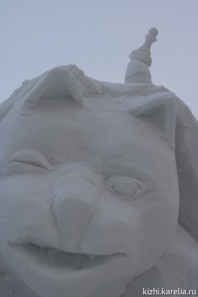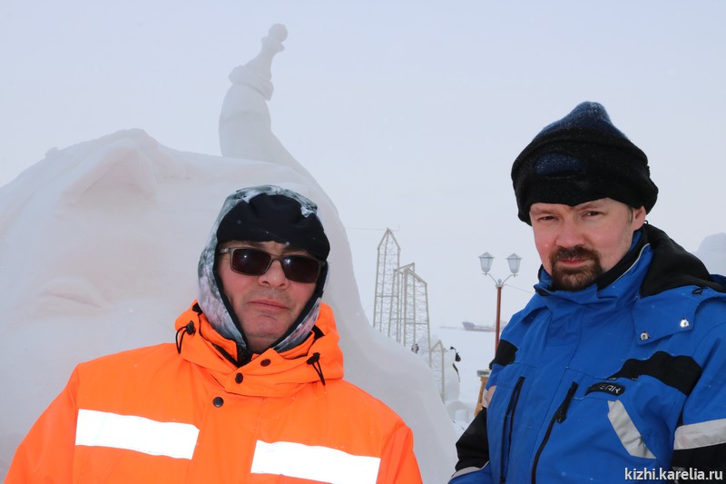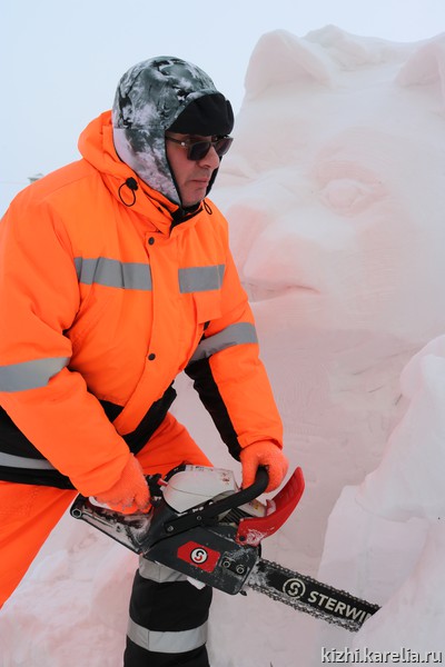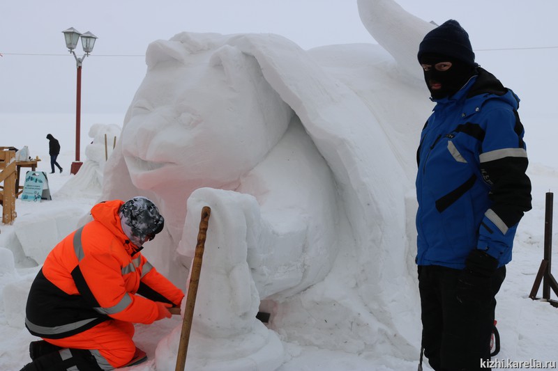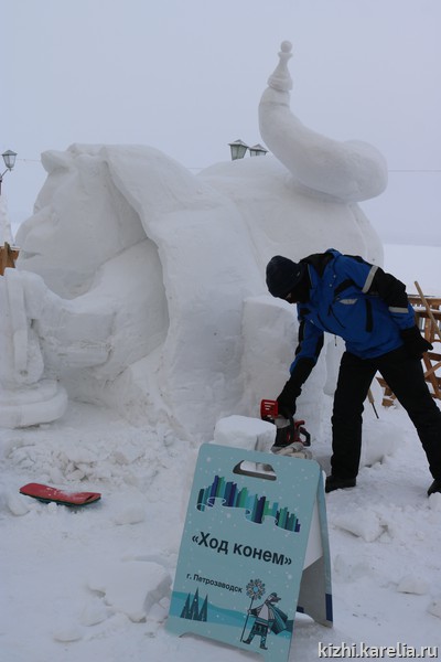 «Ночь предстоит бессонная» — призналась команда музея «Кижи» на конкурсе снежных и ледовых скульптур «Гиперборея — 2021». Сергей Лобанов, Николай Челомбитько и Светлана Петрякова работают над авторской скульптурой «Ход конем»: кот под ковром спрятал хозяйские шахматы и пытается сделать свой хитрый ход. На затею не хватило трех дней, снег не липкий. Скульпторы высекают фигуру из двухметрового снежного куба. Чуть больше отпилили, уже обратно не приклеишь, поэтому приходится семь раз отмерить — один отрезать. Команда опытная, не раз участвуют в конкурсе, поэтому уверены, что к утру все будет готово. Уже завтра жюри зрители отдадут свои предпочтения работам мастеров. Удачи вам, ребята!