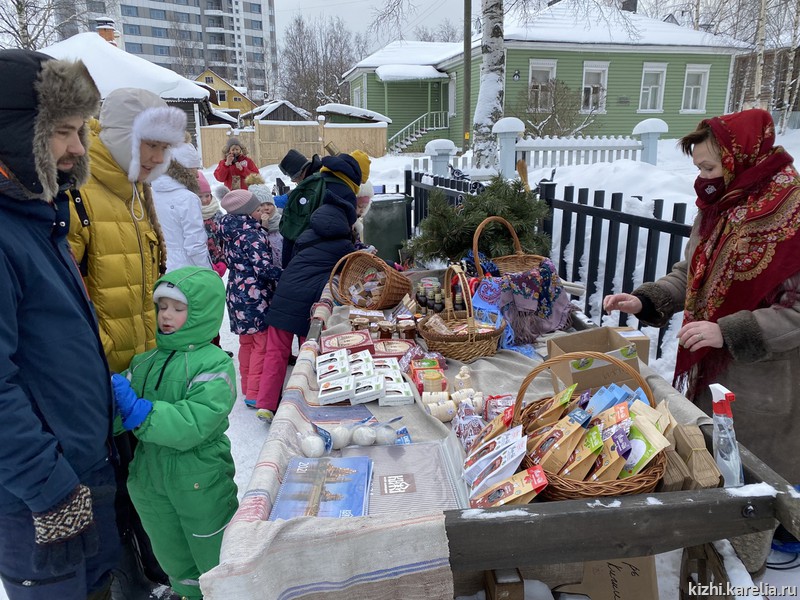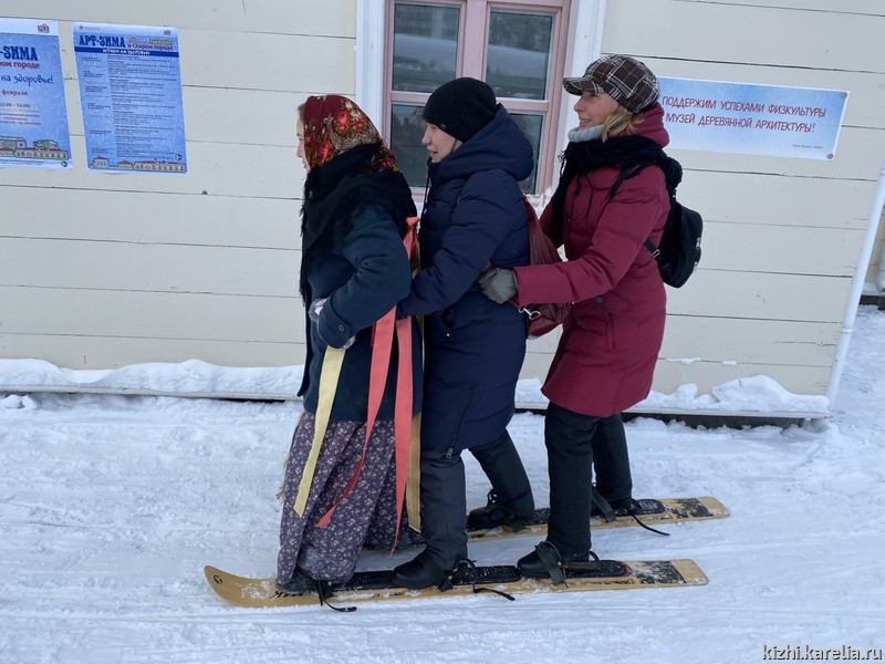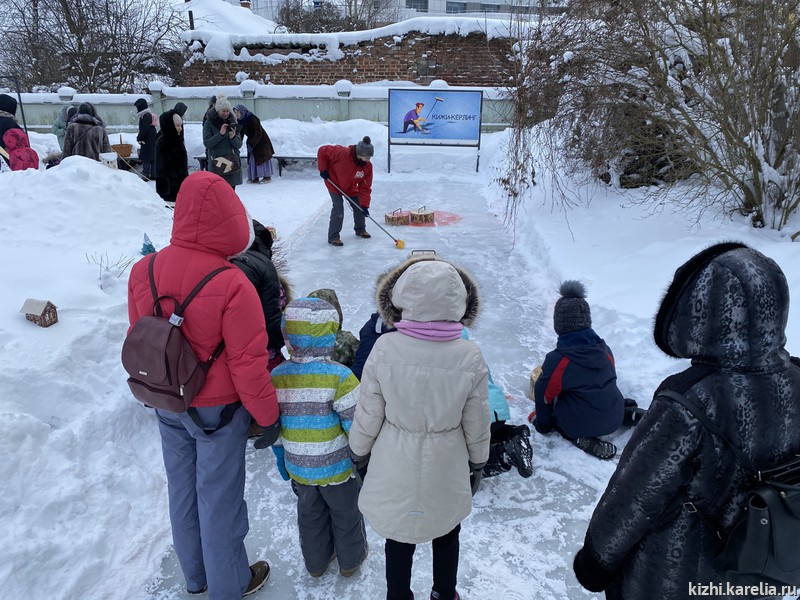 Всего было организовано 15 игровых площадок. Назовем только самые популярные — «Кижи-керлинг», «Охотничья тропа» с гонками на семейных лыжах и санках-финках, «Кижское древоборье».