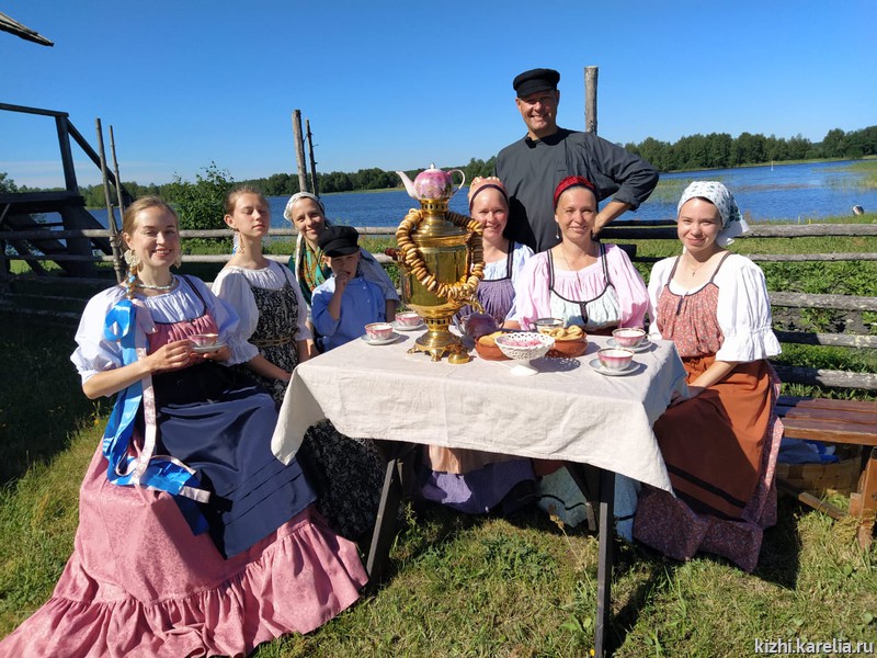 Гости острова фотографируются с девушками за столом с самоваром, слушают историю копорского чая и узнают поговорки Заонежья, где всегда любили чаевничать: «Попьешь чайку — забудешь тоску», «За чаем не скучаем».