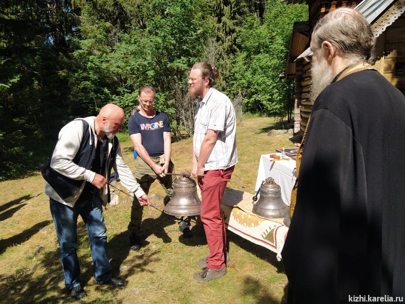 Первым испытал колокола кижский звонарь Игорь Хуттер, его игру подхватили звонари из Вологды и Москвы. Это уже десятая звонница, оборудованная на часовнях Кижских шхер, и четвертый исторический объект, приведенный в порядок «трудами и чаяниями» благотворителей Дмитрия Заренкова и Романа Андрюшкина, которые на лето приезжают с семьями из Санкт-Петербурга в Заонежье (деревня Щепино).