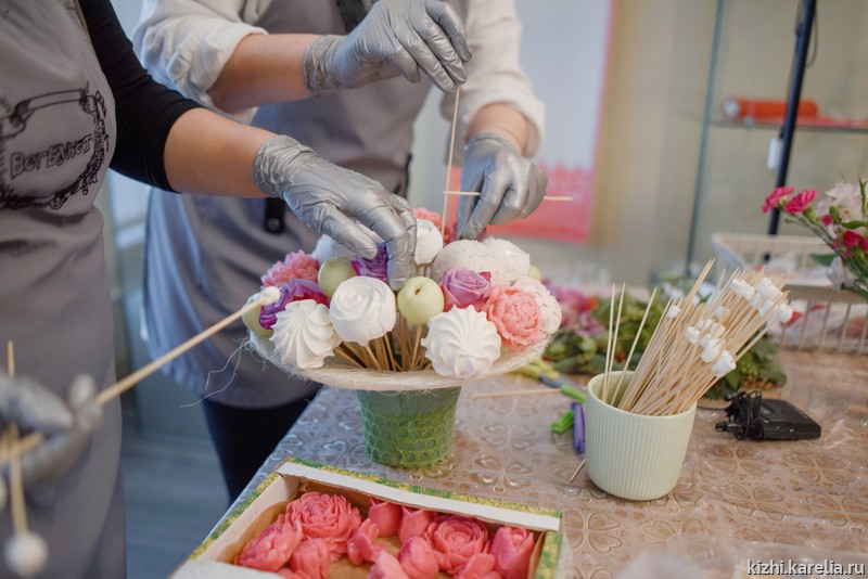 Яркий фруктовый аромат витал по презентационному залу музея «Кижи», где состоялась очередная встреча проекта «Дизайнерские среды». В этот раз фуд-флорист Юлия Чувьюрова и её дочь Ульяна, мастерски складывая ягодку за ягодкой, добавляя мармелад, ароматный натуральный зефир собственного производства, на глазах посетителей создали шедевр — вкусный и композиционно выверенный букет.