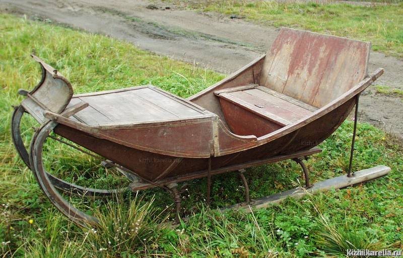 Различные старинные сани — «волокуши» и «розвальни» (самые простые сани для хозяйственных перевозок), выездные нарядные сани-»кресла», узкие быстрые «гонки», обозные сани, детские салазки — представлены на основной экспозиции острова Кижи у амбара из деревни Нинисельга.