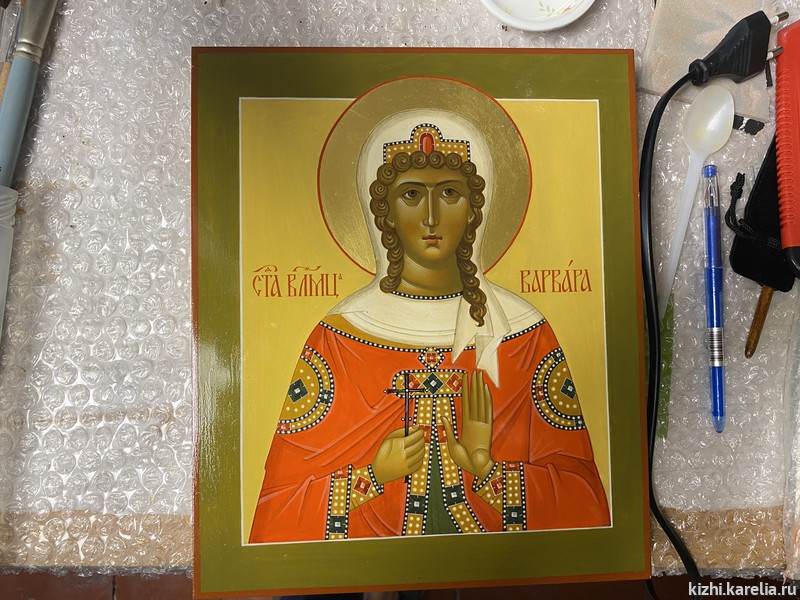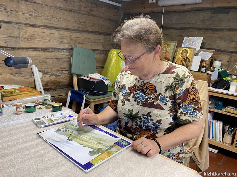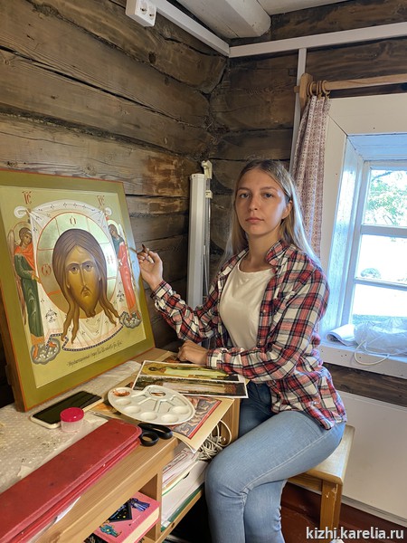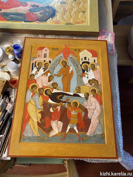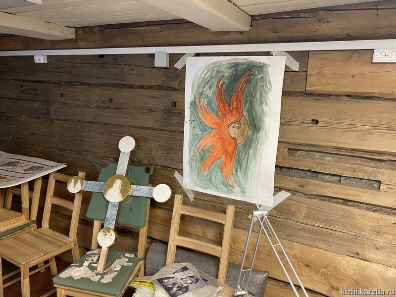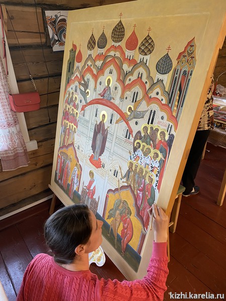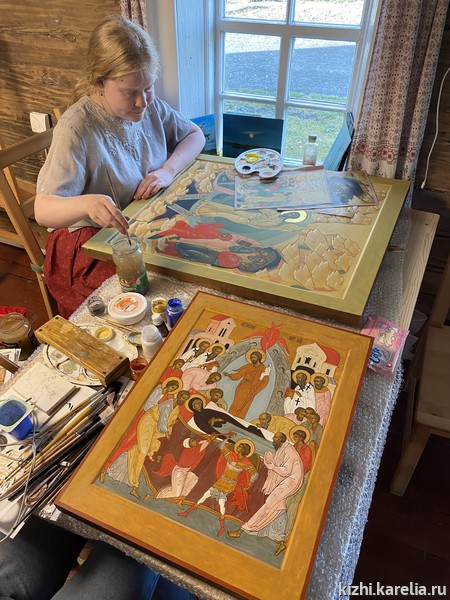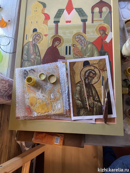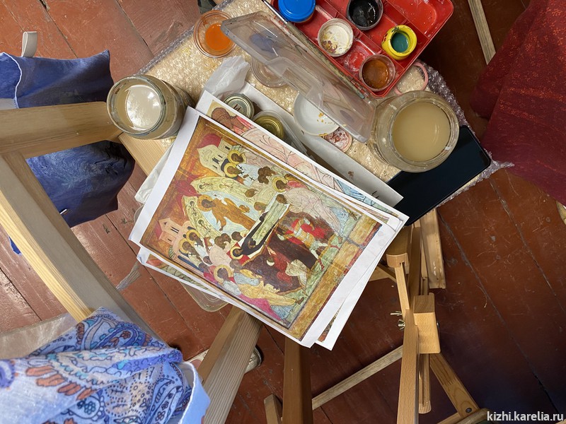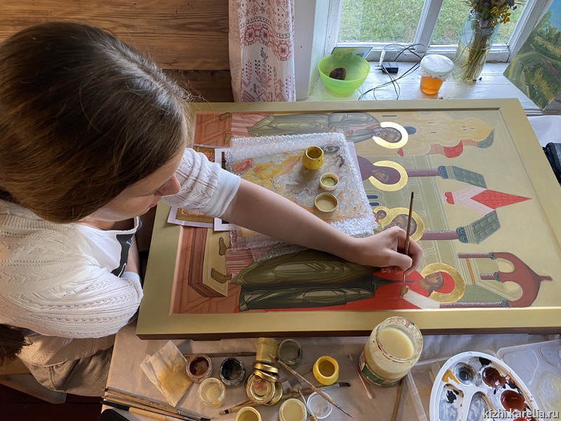 За две недели работы в мастерской иконописцы сделали списки пяти икон для церкви Покрова Пресвятой богородицы на Кижском погосте, часовни Спаса Нерукотворного на Нарьиной горе близ деревни Ямка и часовни Успения Богородицы в деревне Васильево.