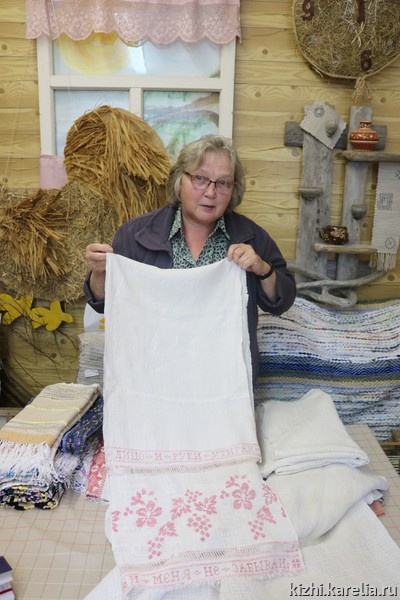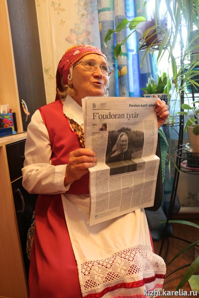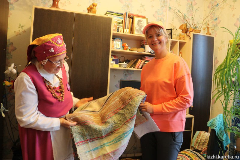 Валентина Васильевна Либерцова пригласила участников экспедиции к себе домой и рассказала о своем роде, о жизни в карельской деревне Коткозеро. Сейчас она активно участвует в событиях карельской культуры, ведет свой проект «Читаем „Калевалу“ на карельском языке, удивляет своей энергией и творческой фантазией. Валентина Васильевна передала в фонды музея „Кижи“ семейную реликвию — домотканую дорожку, которой более пятидесяти лет, сотканную в родительском доме.