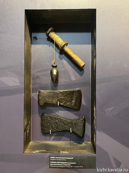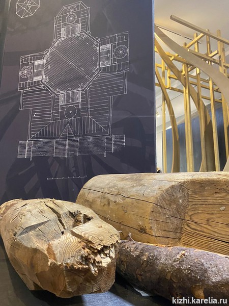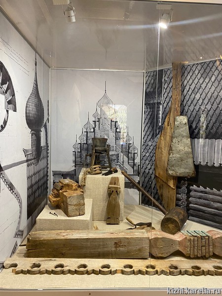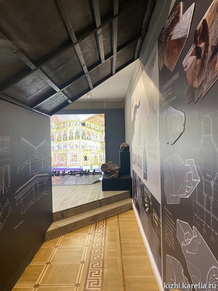 У посетителей под ногами деревянный подиум, имитирующий исторический пол храма. По бокам расположены детали конструкций, старинные бревна с «врубками». Экспонируются инструменты и чертежи.
