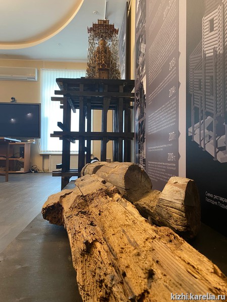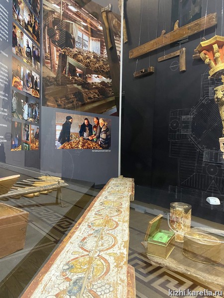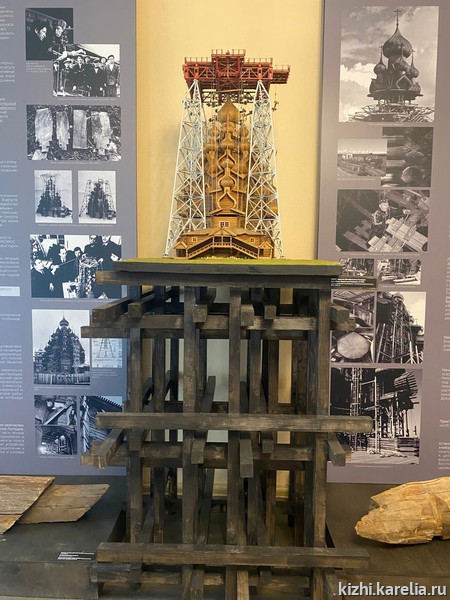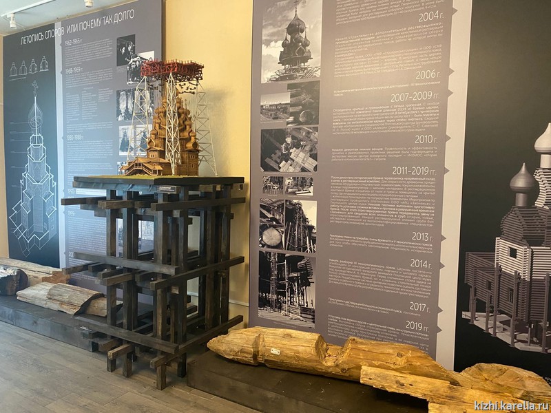 Это 40 лет кропотливого созидательного труда сотен людей- инженеров, реставраторов, плотников, ученых, сотрудников музея. Фотогалерея «героев возрождения» встречает посетителей в фойе музея. Здесь же представлен макет самого шедевра — 22-главой церкви Преображения Господня.