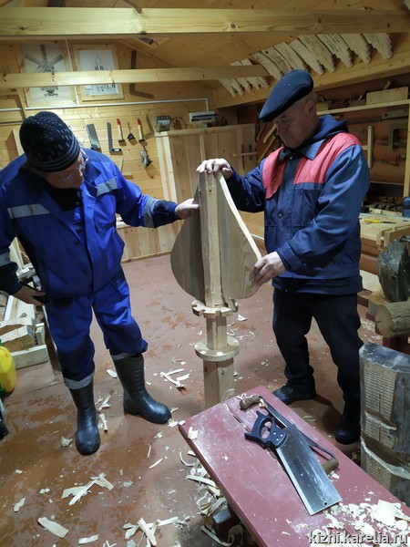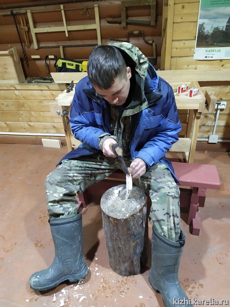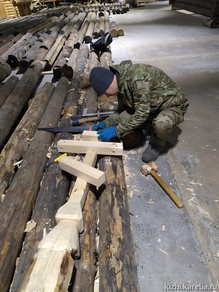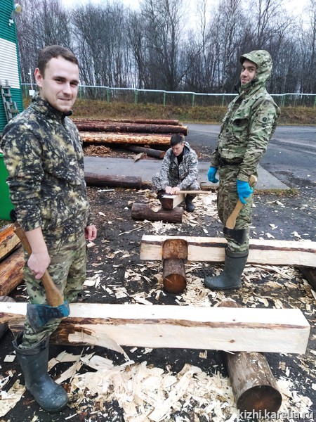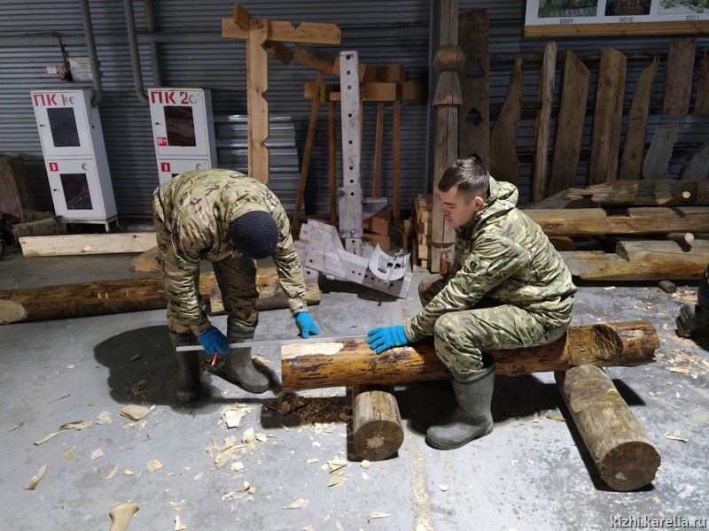 Под руководством лучших плотников музея «Кижи» были выполнены работы по окорке и сомлению бревен, причерчиванию и рубке чаш, как утилитарных круглых, так и с прямым и ветровым шипом, а также опробована рубка соединений в прямую и косую лапу (ласточкин хвост).